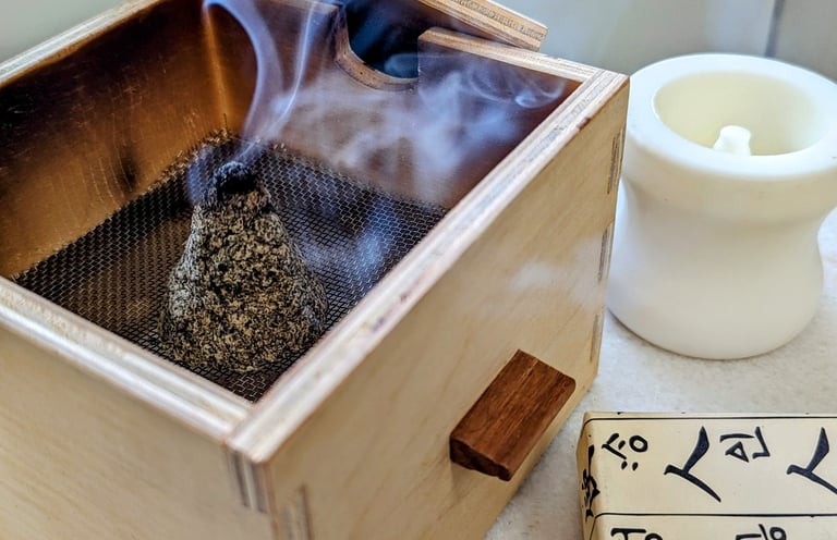 Moxibustion warms specific acupuncture points using mugwort herb. It's believed to improve circulation and may help with pain, fatigue, and digestive issues